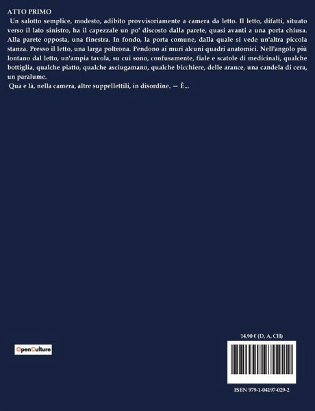 ATTO PRIMO Un salotto semplice, modesto, adibito provvisoriamente a camera da letto. Il letto, difatti, situato verso il lato sinistro, ha il capezzale un po' discosto dalla parete, quasi avanti a una porta chiusa. Alla parete opposta, una finestra. In fondo, la porta comune, dalla quale si vede un'altra piccola stanza. Presso il letto, una larga poltrona. Pendono ai muri alcuni quadri anatomici. Nell'angolo più lontano dal letto, un'ampia tavola, su cui sono, confusamente, fiale e scatole di medicinali, qualche bottiglia, qualche piatto, qualche asciugamano, qualche bicchiere, delle arance, una candela di cera, un paralume. Qua e là, nella camera, altre suppellettili, in disordine. ¿ È...