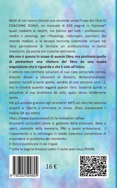 Molti di voi hanno chiesto una versione semplificata del libro LE COACHING SDHEA, un manuale di 636 pagine in francese* quasi inadatto ai neofiti ma biblico per tutti i professionisti, medici o psicologi, per riflessologi, naturopati, psichiatri, dal mondo medico e dal mondo medico e le terapie tecniche sistemiche contenute nel libro permettono di formare un professionista in un tempo brevissimo da poche ore a poche settimane.Ma non è questo lo scopo di questo libro, ma piuttosto quello di permettere una rilettura del libro da una nuova angolazione che ti riguarda e che è solo all'inizio.Il lettore non cercherà soluzioni per il suo caso personale (stress, disturbi dovuti a situazioni di disastro, demoralizzazione, ideazione del suicidio o varie apatie, perdita di una persona cara ...), ma le troverà, se legge questo libro. Scoprirà quindi la soluzione al suo problema da solo, quasi senza rendersene conto.Hai già accesso gratuito agli strumenti MP3 sul sito Web che ti permetteranno di ridurre o eliminare lo stress. https://www.successcoach.fr/la-relaxation-sdheaStrumenti utilizzabili come la gestione delle emozioni, la dietetica o lo sport, il controllo della memoria, la PNL, l'ipnosi eriksoniana, il rilassamento o la sofrologia in modo sistemico consentono di rispondere ai problemi del momento. Il libro è pubblicato in sei lingue.