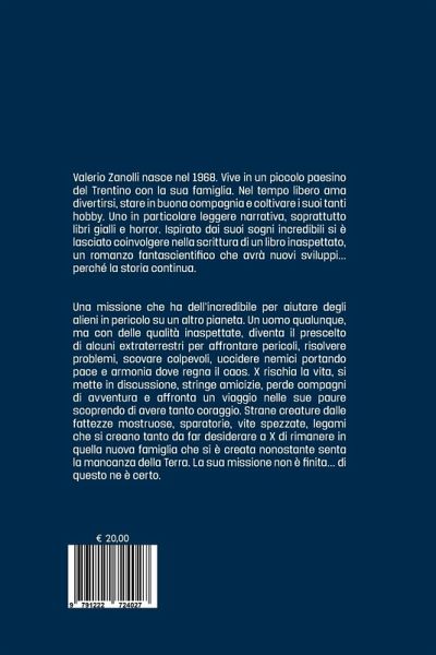 Una missione che ha dell'incredibile per aiutare degli alieni in pericolo su un altro pianeta. Un uomo qualunque, ma con delle qualità inaspettate, diventa il prescelto di alcuni extraterrestri per affrontare pericoli, risolvere problemi, scovare colpevoli, uccidere nemici portando pace e armonia dove regna il caos. X rischia la vita, si mette in discussione, stringe amicizie, perde compagni di avventura e affronta un viaggio nelle sue paure scoprendo di avere tanto coraggio. Strane creature dalle fattezze mostruose, sparatorie, vite spezzate, legami che si creano tanto da far desiderare a X di rimanere in quella nuova famiglia che si è creata nonostante senta la mancanza della Terra. La sua missione non è finita... di questo ne è certo.