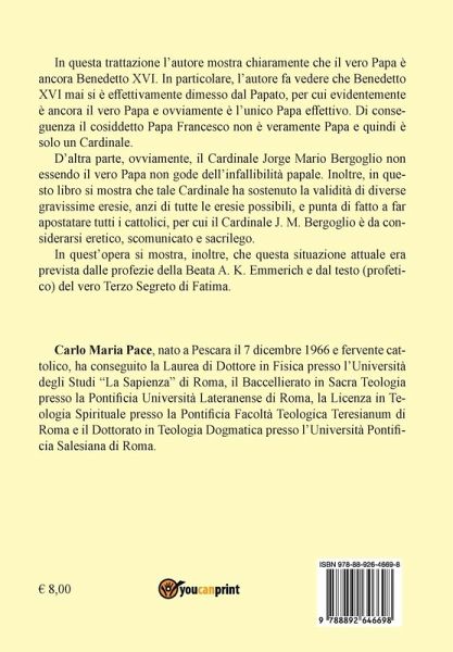 In questa trattazione l'autore mostra chiaramente che il vero Papa è ancora Benedetto XVI. In particolare, l'autore fa vedere che Benedetto XVI mai si è effettivamente dimesso dal Papato, per cui evidentemente è ancora il vero Papa e ovviamente è l'unico Papa effettivo. Di conseguenza il cosiddetto Papa Francesco non è veramente Papa e quindi è solo un Cardinale. D'altra parte, ovviamente, il Cardinale Jorge Mario Bergoglio non essendo il vero Papa non gode dell'infallibilità papale. Inoltre, in questo libro si mostra che tale Cardinale ha sostenuto la validità di diverse gravissime eresie, anzi di tutte le eresie possibili, e punta di fatto a far apostatare tutti i cattolici, per cui il Cardinale J. M. Bergoglio è da considerarsi eretico, scomunicato e sacrilego. In quest'opera si mostra, inoltre, che questa situazione attuale era prevista dalle profezie della Beata A. K. Emmerich e dal testo (profetico) del vero Terzo Segreto di Fatima.