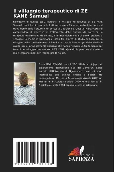 L'obiettivo di questa tesi, intitolata: Il villaggio terapeutico di ZE KANE Samuel: pratiche di cura delle fratture ossee a Nièté, è quello di far luce sul trattamento delle fratture in un contesto tradizionale. Questa ricerca cerca di comprendere il processo di trattamento delle fratture da parte di un terapeuta tradizionale, da un lato, e le motivazioni che spingono i pazienti a scegliere la medicina tradizionale, dall'altro. L'area di studio si basa su un villaggio dell'arrondissement di Nièté e la popolazione target dello studio è quella locale, principalmente i pazienti che hanno ricevuto un trattamento per traumi nel villaggio terapeutico di ZE KANE. Quando le persone si sentono male, cercano modi per recuperare la salute.