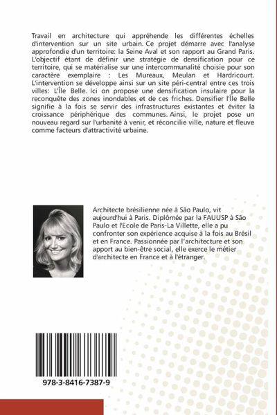Travail en architecture qui appréhende les différentes échelles d'intervention sur un site urbain. Ce projet démarre avec l'analyse approfondie d'un territoire: la Seine Aval et son rapport au Grand Paris. L'objectif étant de définir une stratégie de densification pour ce territoire, qui se matérialise sur une intercommunalité choisie pour son caractère exemplaire : Les Mureaux, Meulan et Hardricourt. L'intervention se développe ainsi sur un site péri-central entre ces trois villes: L'Île Belle. Ici on propose une densification insulaire pour la reconquête des zones inondables et de ces friches. Densifier l'Île Belle signifie à la fois se servir des infrastructures existantes et éviter la croissance périphérique des communes. Ainsi, le projet pose un nouveau regard sur l'urbanité à venir, et réconcilie ville, nature et fleuve comme facteurs d'attractivité urbaine.