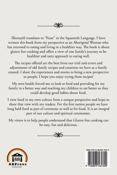 Ilhenayhl translates to "Feast" in the Squamish Language. I have written this book from my perspective as an Aboriginal Woman who has returned to eating and living in a healthier way. The book is about gluten free cooking and offers a view of one family's journey to be healthier and tasty approach to eating as well. The recipes offered are the best from our trial and errors and adjustments of old family recipes and creations we have as a family created. I share the experiences and stories to bring a new perspective to people. I hope you enjoy trying these recipes! My own health forced me to look at food and providing for my family in a better way and teaching my children to eat better so they could develop good habits about food. I view food in my own culture from a unique perspective and hope to share that view with my readers. For the first nation people we have long held food as part of ceremony as well as for food. It is an integral part of our culture and spiritual ceremonies. My vision is to help people understand that Gluten free cooking can be easy, fun and delicious.