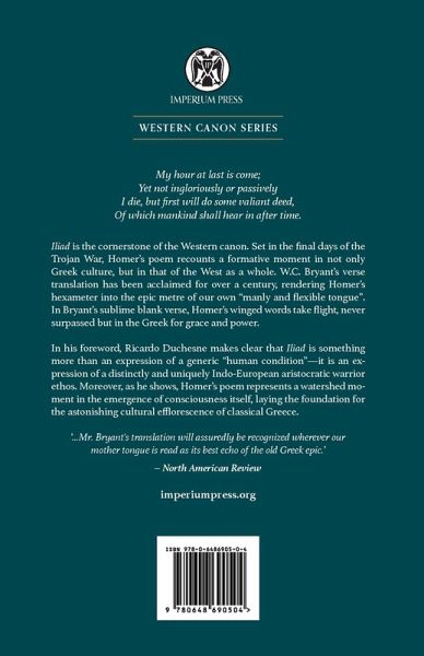 Set in the final days of the Trojan War, Homer’s poem recounts a formative moment in not only Greek culture, but in that of the West as a whole. W.C. Bryant’s verse translation has been acclaimed for over a century, rendering Homer’s hexameter into the epic metre of our own "manly and flexible tongue". In Bryant’s sublime blank verse, Homer’s winged words take flight, never surpassed but in the Greek for grace and power. In his foreword, Ricardo Duchesne makes clear that Iliad is something more than an expression of a generic "human condition"—it is an expression of a distinctly and uniquely Indo-European aristocratic warrior ethos. Moreover, as he shows, Homer’s poem represents a watershed moment in the emergence of consciousness itself, laying the foundation for the astonishing cultural efflorescence of classical Greece. As part of Imperium Press’ Western Canon series, this definitive edition offers supplementary material placing this work at the centre of our aesthetic, intellectual, and spiritual life—where it belongs. This edition of Iliad includes a map, genealogies, a full glossary of every name in the text, and a bibliography with a view to traditionalist readings.