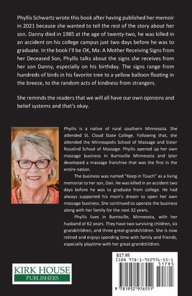 Phyllis Schwartz wrote this book after having published her memoir in 2021 because she wanted to tell the rest of the story about her son. Danny died in 1985 at the age of twenty-two, he was killed in an accident on his college campus just two days before he graduated. In the book I'll be OK, Ma: A Mother Receiving Signs from her Deceased Son, Phyllis talks about the signs she receives from her son Danny, especially on his birthday. The signs range from hundreds of birds in his favorite tree to a yellow balloon floating in the breeze, to the random acts of kindness from strangers. She reminds the readers that we will all have our own opinions and belief systems and that's okay.