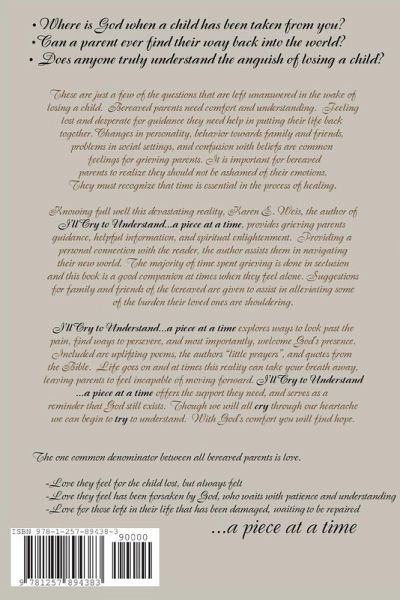 The author, Karen E. Weis, understands the devastating effects of losing a child. In March of 2006 she and her husband lost their son in a car accident. About six months after losing her son, she started writing in hopes of helping other grieving parents. Finding strength in the words that were kept deep within her, she wanted to find her voice to support and connect with parents experiencing the grief of losing a child. Karen also wanted to make family and friends more aware of how difficult the journey is after losing a child so they could help the parents cope. Her hope is to inspire parents to endure and realize they will survive their loss and with time find peace.