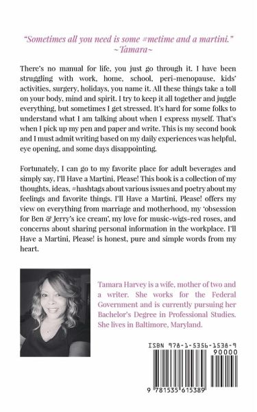 "Sometimes all you need is some #metime and a martini." ~ Tamara There's no manual for life, you just work your way through it. I have been struggling with work, home, school, peri-menopause, kids' activities, surgery, holidays, you name it. All these things take a toll on your body, mind and spirit. I try to keep it all together and juggle everything to make it work. But sometimes I get stressed. It's hard for some folks to understand what I am talking about when I express myself. That's when I pick up my pen and paper and write. This is my second book and I must admit writing based on my daily experiences was helpful, eye opening, and some days disappointing. Fortunately, I can go to my favorite place for adult beverages and simply say, I'll Have a Martini, Please! This book is a collection of my thoughts, ideas, #hashtags about various issues and poetry about my feelings and favorite things. I'll Have a Martini, Please! offers my view on everything from marriage and motherhood, my 'obsession for Ben & Jerry's ice cream', my love for music-wigs-red roses, and concerns about sharing personal information in the workplace. I'll Have a Martini, Please! is honest, pure and simple words from my heart.