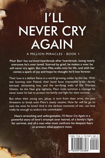 Pitor Barr has survived heartbreak after heartbreak, losing nearly everyone he's ever loved. Scarred by grief, he makes a vow: he will never cry again. But then Mila walks into his life, and with her comes a spark of joy and hope he thought he'd lost forever. Their love is a defiant flame in a world growing colder by the day. With war looming over Poland, their bond faces impossible trials-family betrayal, devastating loss, and the terrifying walls of the Warsaw Ghetto. As the Nazi grip tightens, Pitor must summon a courage he never knew he had to protect his family and fight for their survival. But when their young son, Jakup, is torn from their arms, the pain threatens to break even Pitor's steely resolve. How far will he go to save the ones he loves? And in the darkest moments of war, can love really be enough to endure the unthinkable? Heart-wrenching and unforgettable, I'll Never Cry Again is a powerful story of love's triumph over hatred, of a family's fight for survival, and of a man who must confront his deepest fears to protect what matters most.
