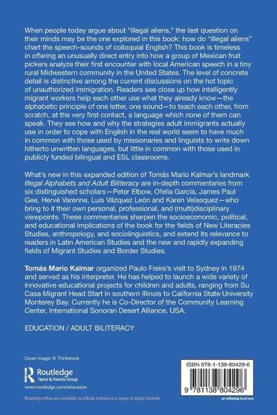How do "illegal aliens" chart the speech sounds of colloquial English? This book is timeless in offering an unusually direct entry into how a group of Mexican fruit pickers analyze their first encounter with local American speech in a tiny rural Midwestern community in the United States. Readers see close up how intelligently migrant workers help each other use what they already know-the alphabetic principle of one letter, one sound-to teach each other, from scratch, at the very first contact, a language which none of them can speak. They see how and why the strategies adult immigrants actually use in order to cope with English in the real world seem to have little in common with those used in publicly funded bilingual and ESL classrooms. What's new in this expanded edition of Tomás Mario Kalmar's landmark Illegal Alphabets and Adult Biliteracy are in-depth commentaries from six distinguished scholars-Peter Elbow, Ofelia García, James Paul Gee, Hervé Varenne, Luis Vázquez León, Karen Velasquez-who bring to it their own personal, professional, and (multi)disciplinary viewpoints.