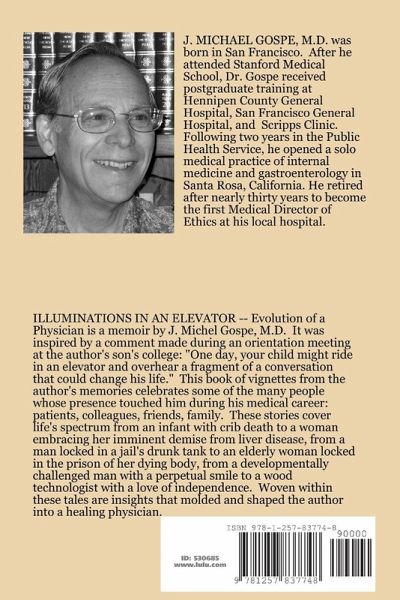 ILLUMINATIONS IN AN ELEVATOR - Evolution of a Physician is a memoir by J. Michael Gospe, M.D. It was inspired by a comment made during an orientation meeting at the author's son's college: "One day, your child might ride in an elevator and overhear a fragment of a conversation that could change his life." This book of vignettes from the author's memories celebrates some of the many people whose presence touched him during his medical career: family, friends, colleagues, patients. These stories cover life's spectrum from an infant with crib death to a woman embracing her imminent demise from liver disease, from a man locked in a jail's drunk tank to an elderly woman locked in the prison of her dying body, from a developmentally challenged man with a perpetual smile to a wood technologist with a love of independence. Woven within these tales are insights that molded and shaped the author into a healing physician.