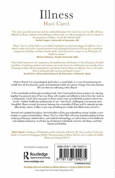 "Havi Carel's Illness: The Cry of the Flesh is a wonderful introduction to phenomenology of medicine. It is a clearly written and richly nuanced personal and philosophical account of living with uncertainty, progressive disability, and fear of early death. Epicurus, Heidegger, Merleau-Ponty, and others are used as sources of ideas for living well - creatively and flexibly - with illness. This third edition is revised and updated throughout (including a new chapter on the meaning of organ transplantation), yet keeps the import and directness of the original 2008 edition. I look forward to using it in my Philosophy of Medicine classes." Miriam Solomon, Temple University, USA