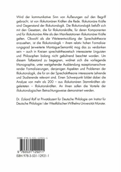 Wird der kommunikative Sinn von Äußerungen auf den Begriff gebracht, ist von illokutionären Kräften die Rede. Illokutionäre Kräfte sind Gegenstand der Illokutionslogik. Die Illokutionslogik befaßt sich mit den Gesetzen, die für Ikollutionskräfte, für deren Komponenten und für illokutionäre Akte als den Manifestationen illokutionärer Kräfte gelten. Obwohl als DIE Weiterentwicklung der Sprechakttheorie anzusehen, ist die Illokutionslogik - ihrem relativ hohen Formalisierungsgrad (erweiterte Montague-Semantik) mag das zu verdanken sein - auch in Kreisen sprechakttheoretisch interessierter Linguisten und Philosophen bislang nicht gebührend beachtet worden. Um diesem Tatbestand zu begegnen, widmet sich diese Monographie, unter weitgehender Ausblendung rezeptionserschwerender Formalisierungen, denjenigen Aspekten und Problemen der Illokutionslogik, die für an der Sprechakttheorie interessierte Lehrende und Studierende relevant sind. Einen Schwerpunkt bildet dabei die Analyse von mehr als 200 - aus illokutionären Stammkräften abgeleiteten - Illokutionskräften. An ihnen sollen die Vorteile der illokutionslogischen Betrachtungsweise demonstriert werden.