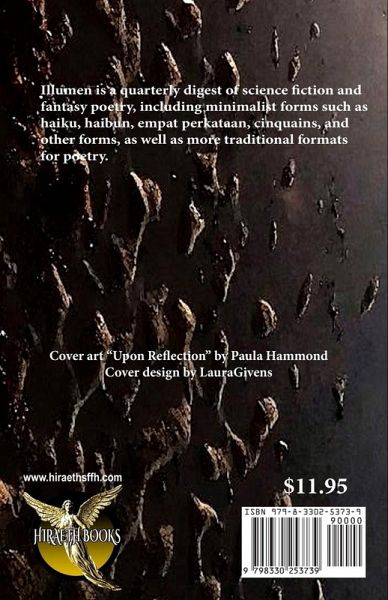 Illumen is a quarterly digest of science fiction and fantasy poetry, including minimalist forms such as haiku, haibun, empat perkataan, cinquains, and other forms, as well as more traditional formats for poetry. Featured Poets: Lee Clark Zumpe Allister Nelson Cover art by Paula Hammond Interior illustrations by Sandy DeLuca