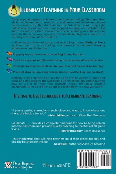 In Illuminate, author, educator, and technology trainer Bethany Petty explains how to use technology to improve your students' learning experiences. This book is packed full of powerful ideas you can use in your classroom tomorrow! Broken into 10 easy to digest chapters - take a journey through technology integration and be inspired to use technology in really meaningful ways in your classroom. You'll discover . . . Engaging ways to incorporate technology in any classroom Tips for using apps and QR codes to improve communication with parents Strategies to empower students (and you) to reflect on and share learning Practical ideas for increasing collaboration, critical thinking, and creativity. Bethany shares specific how-tos for using a wide variety of apps and tools. She also explains the why behind using technology, and shows you how to use it to meet your students' needs and make learning memorable. After all, it's not about the technology; it's how you use it! It's time to illuminate learning and use technology to enhance your students' experience.