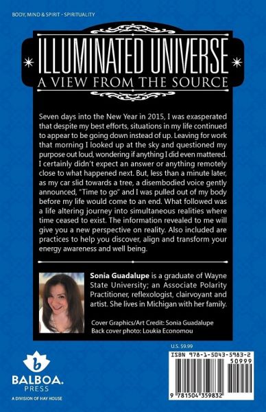 Seven days into the New Year in 2015, I was exasperated that despite my best efforts, situations in my life continued to appear to be going down instead of up. Leaving for work that morning I looked up at the sky and questioned my purpose out loud, wondering if anything I did even mattered. I certainly didn't expect an answer or anything remotely close to what happened next. But, less than a minute later, as my car slid towards a tree, a disembodied voice gently announced, "Time to go" and I was pulled out of my body before my life would come to an end. What followed was a life altering journey into simultaneous realities where time ceased to exist. The information revealed to me will give you a new perspective on reality. Also included are practices to help you discover, align and transform your energy awareness and well being.