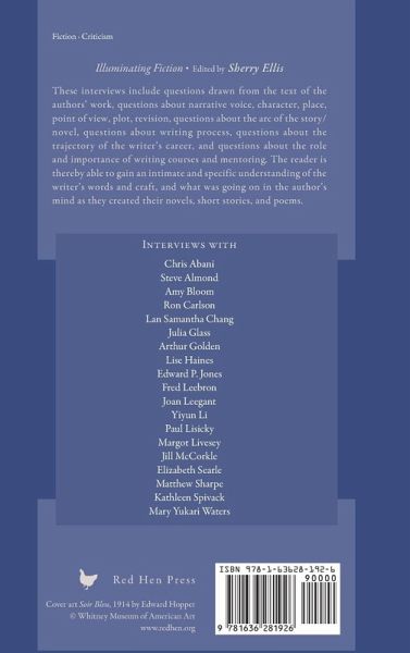 Illuminating Fiction contains nineteen interviews with fiction-writing luminaries including Edward P. Jones,  Julia Glass, Amy Bloom, Jill McCorkle, Margot Livesy, Ron Carlson and Steve  Almond.  The interviews contain questions about narrative, voice,  character, place, point of view, arc of the story/novel plot, and revision;  questions about the writing process; questions about the trajectory of the writer's career; questions about the role and importance of writing courses and mentoring; and also questions that Ellis has drawn from the text of the authors'  work.  Authors describe the challenges they have faced.  The reader is able to gain an intimate and specific understanding of the authors' works, and the authors' thought process as they created their novels and short stories.