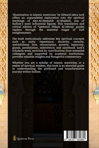 Embark on a profound journey into the heart of Sufi wisdom with "Illumination in Islamic Mysticism" by Edward Jabra Jurji. Within the pages of this captivating book, readers will discover a treasure trove of timeless teachings, meticulously translated and enriched with insightful commentary. Delve into the essence of Sufism as each chapter unfolds a new facet of illumination, guiding you towards spiritual awakening and enlightenment. From the foundational principles of unity and repentance to the profound realms of love, renunciation, and gnosis, this book serves as a comprehensive guide to spiritual enlightenment. Explore the core teachings with clarity and depth as each maxim illuminates the path to inner realization. Journey through the twelve articles that encompass the essence of Sufi mysticism, supplemented by a meticulous analysis of various maxims. Conclude your voyage with invaluable insights and counsel, guiding you towards a deeper understanding of the mystical traditions. Edward Jabra Jurji extends his gratitude to esteemed scholars and institutions whose invaluable guidance and support enriched the journey of bringing this profound work to light. "Illumination in Islamic Mysticism" has garnered acclaim from scholars and readers alike for its meticulous scholarship and profound insights into Sufi wisdom. With endorsements from esteemed institutions like Princeton University and the American Council of Learned Societies, this book stands as a testament to the enduring relevance of Sufi teachings in the contemporary world.Whether you are a scholar, seeker, or simply curious about the mystical dimensions of Islam, "Illumination in Islamic Mysticism" promises to enlighten, inspire, and transform your understanding of spirituality. Embrace the wisdom of the Sufi tradition and embark on a journey towards inner illumination and divine realization.