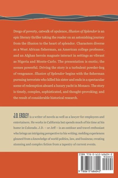 Dregs of poverty, catwalk of opulence, Illusion of Splendor is an epic literary thriller taking the reader on an astonishing journey from the illusion to the heart of splendor. Characters diverse as a West African fisherman, an American college professor, and an Afghan heroin magnate interact in settings as vibrant as Nigeria and Monte-Carlo. The presentation is exotic; the scenes powerful. Driving the story is a turbulent powder-keg of vengeance. Illusion of Splendor begins with the fisherman pursuing terrorists who killed his sister and ends in a spectacular scene of redemption aboard a luxury yacht in Monaco. The story is timely, complex, sophisticated, and thought-provoking; and the result of considerable historical research.