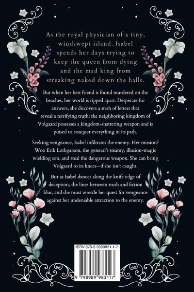She's stealing more than secrets. As the royal physician of a tiny, windswept island, Isabel spends her days trying to keep the queen from dying and the mad king from streaking naked down the halls. But when her best friend is found murdered on the beaches, her world is ripped apart. Desperate for answers, she discovers a stash of letters that reveal a terrifying truth: the neighboring kingdom of Volgaard possesses a kingdom-shattering weapon and is poised to conquer everything in its path. Seeking vengeance, Isabel infiltrates the enemy. Her mission? Woo Erik Lothgarson, the general's steamy, illusion-magic wielding son, and steal the dangerous weapon. She can bring Volgaard to its knees-if she isn't caught. But as Isabel dances along the knife edge of deception, the lines between truth and fiction blur, and she must wrestle her quest for vengeance against her undeniable attraction to the enemy. The sexy enemies-to-lovers tension of THE BRIDGE KINGDOM meets the snarky banter of A DAWN OF ONYX in this swoon-worthy romantasy.