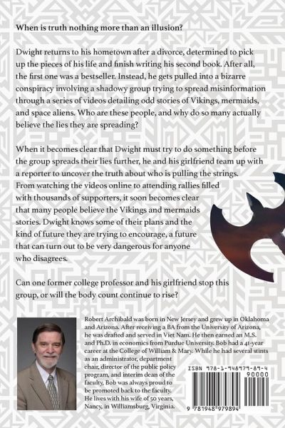 When is truth nothing more than an illusion?Dwight returns to his hometown after a divorce, determined to pick up the pieces of his life and finish writing his second book. After all, the first one was a bestseller. Instead, he gets pulled into a bizarre conspiracy involving a shadowy group trying to spread misinformation through a series of videos detailing odd stories of Vikings, mermaids, and space aliens. Who are these people, and why do so many actually believe the lies they are spreading? When it becomes clear that Dwight must try to do something before the group spreads their lies further, he and his girlfriend team up with a reporter to uncover the truth about who is pulling the strings. From watching the videos online to attending rallies filled with thousands of supporters, it soon becomes clear that many people believe the Vikings and mermaids stories. Dwight knows some of their plans and the kind of future they are trying to encourage, a future that can turn out to be very dangerous for anyone who disagrees.Can one former college professor and his girlfriend stop this group, or will the body count continue to rise?