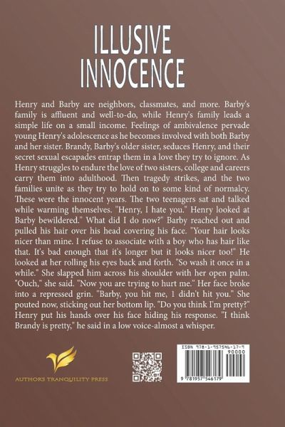Henry and Barby are neighbors, classmates, and more. Barby's family is affluent and well-to-do, while Henry's family leads a simple life on a small income. Feelings of ambivalence pervade young Henry's adolescence as he becomes involved with both Barby and her sister. Brandy, Barby's older sister, seduces Henry, and their secret sexual escapades entrap them in a love they try to ignore. As Henry struggles to endure the love of two sisters, college and careers carry them into adulthood. Then tragedy strikes, and the two families unite as they try to hold on to some kind of normalcy. These were the innocent years. The two teenagers sat and talked while warming themselves. "Henry, I hate you." Henry looked at Barby bewildered. "What did I do now?" Barby reached out and pulled his hair over his head covering his face. "Your hair looks nicer than mine. I refuse to associate with a boy who has hair like that. It's bad enough that it's longer but it looks nicer too!" He looked at her rolling his eyes back and forth. "So wash it once in a while." She slapped him across his shoulder with her open palm. "Ouch," she said. "Now you are trying to hurt me." Her face broke into a repressed grin. "Barby, you hit me, l didn't hit you." She pouted now, sticking out her bottom lip. "Do you think I'm pretty?" Henry put his hands over his face hiding his response. "I think Brandy is pretty," he said in a low voice-almost a whisper.