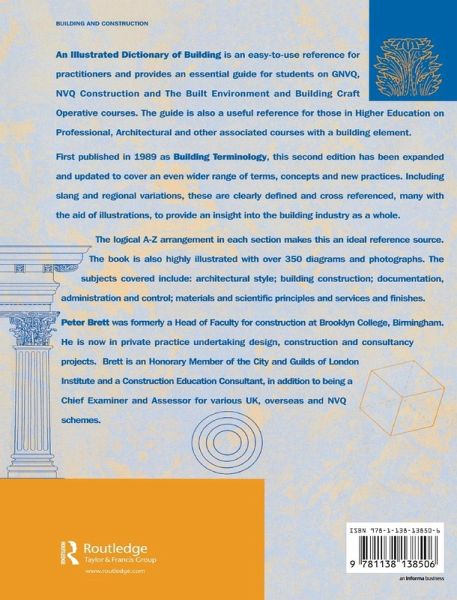 An Illustrated Dictionary of Building is ideal for practitioners and students on GNVQ, NVQ Construction and The Built Environment and Building Craft Operative courses. The guide is also useful reference for those in Higher Education on Professional, Architectural and other associated courses with a building element. First published in 1989 as Building Terminology, this second edition has been expanded and updated to cover an even wider range of terms, concepts and new practices. Including slang and regional variations, these are clearly defined and cross-referenced, many with the aid of illustrations, to provide an insight into the building industry as a whole.The logical A-Z arrangement in each section makes this an ideal reference source. The book is also highly illustrated with over 350 diagrams and photographs. The subjects covered include: architectural style; building construction; documentation, administration and control; materials and scientific principles and services and finishes.Peter Brett was formerly a Head of Faculty for construction at Brooklyn College, Birmingham. He is now in private practice undertaking design, construction and consultancy projects. Brett is an Honorary Member of the City and Guilds of London Institute and a Construction Education Consultant, in addition to being a Chief Examiner and Assessor for various UK, overseas and NVQ schemes.