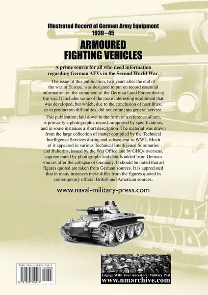 A prime source for all who need information regarding German AFVs in the Second World War. The issue of this publication, two years after the end of the war in Europe, was designed to put on record essential information on the armament of the German Land Forces during the war. It includes some of the more interesting equipment that was developed, but which, due to the conclusion of hostilities, or to production difficulties, did not come into general service. This publication, laid down in the form of a reference album, is primarily a photographic record, supported by specifications, and in some instances a short description. The material was drawn from the large collection of matter compiled by the Technical Intelligence Services during and subsequent to WW2. Much of it appeared in various Technical Intelligence Summaries and Bulletins, issued by the War Office and by GHQs overseas, supplemented by photographs and details added from German sources after the collapse of Germany. It should be noted that all figures quoted are taken from German sources. It is appreciated that in many instances these differ from the figures quoted in contemporary official British and American sources.