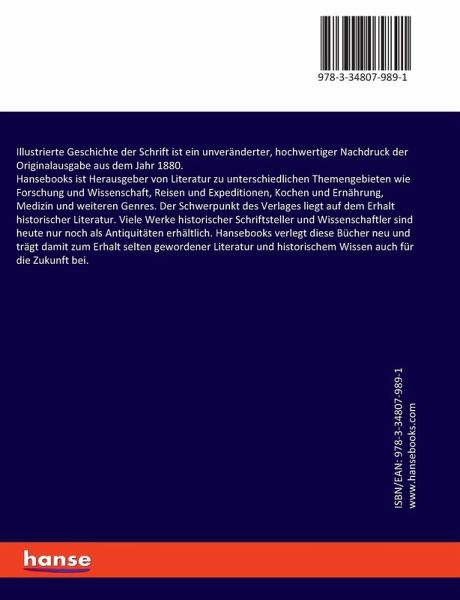 Illustrierte Geschichte der Schrift ist ein unveränderter, hochwertiger Nachdruck der Originalausgabe aus dem Jahr 1880.Hansebooks ist Herausgeber von Literatur zu unterschiedlichen Themengebieten wie Forschung und Wissenschaft, Reisen und Expeditionen, Kochen und Ernährung, Medizin und weiteren Genres. Der Schwerpunkt des Verlages liegt auf dem Erhalt historischer Literatur. Viele Werke historischer Schriftsteller und Wissenschaftler sind heute nur noch als Antiquitäten erhältlich. Hansebooks verlegt diese Bücher neu und trägt damit zum Erhalt selten gewordener Literatur und historischem Wissen auch für die Zukunft bei.