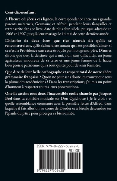 Cent-dix-neuf ans. A l'heure où j'écris ces lignes, la correspondance entre mes grands-parents maternels, Germaine et Alfred, pendant leurs fiançailles et retranscrite dans ce livre, date de plus d'un siècle, puisque adressée en 1906 et 1907, jusqu'à leur mariage le 14 mai de cette dernière année. L'histoire de deux êtres que rien n'aurait dit qu'ils se rencontreraient, qu'ils s'aimeraient autant qu'il est possible d'aimer, si ce n'est la Providence sans cesse évoquée par mon grand-père. D'autres diront que c'est la destinée qui a uni, non sans difficultés, un jeune agriculteur amoureux de sa terre et une jeune femme de la haute bourgeoisie parisienne qui a tout quitté pour devenir fermière. Que dire de leur belle orthographe et respect total de notre chère grammaire française ? Qu'on ne peut sans doute les trouver que sous la plume des académiciens ! Dans les transcriptions, j'ai mis un point d'honneur à respecter toutes leurs ponctuations. Ont-ils atteint tous deux l'inaccessible étoile chantée par Jacques Brel dans sa comédie musicale sur Don Quichotte ? Je le crois ; et quelle ressemblance étonnante avec la première lettre d'Alfred, dans laquelle il fait allusion au conte de Daudet et à l'étoile descendue sur l'épaule du pâtre pour protéger sa bien-aimée.