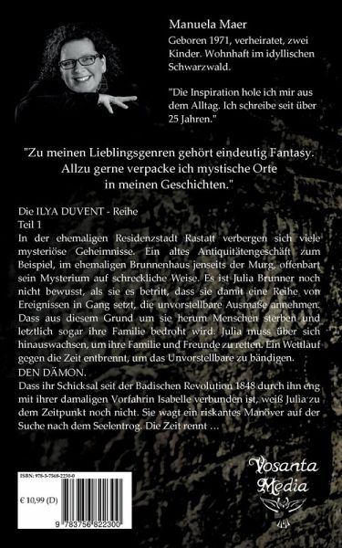 Ilya Duvent - der Sturm in DirDie ehemalige Residenzstadt Rastatt birgt viele mysteriöse Geheimnisse. Ein altes Antiquitätengeschäft im ehemaligen Brunnenhaus, jenseits der Murg, offenbart seines auf schreckliche Weise. Es ist Julia noch nicht bewusst, als sie es betritt, dass sie damit eine Reihe von Ereignissen in Gang setzt, die unvorstellbare Ausmaße annehmen: - das aus diesem Grund, um sie herum, Menschen sterben und letztlich sogar ihre Familie bedroht wird. Ihr Schicksal ist eng mit dem ihrer Vorfahrin Isabelle verbunden, die im Jahr 1848, mitten in den Unruhen der Badischen Revolution, verzweifelt versuchte, dem Martyrium ihrer Ehe zu entkommen.Kann Julia, über 150 Jahre später, verhindern, dass sie einen ähnlichen Verlust erleiden muss wie ihre Ahnin? Sie muss unbedingt den Seelentrog finden - das Buch, das all die grauenhaften Vorgänge beenden kann. Zeigen ihr die Schlüssel den richtigen Weg? ... und auf welcher Seite steht der ... Dämon?