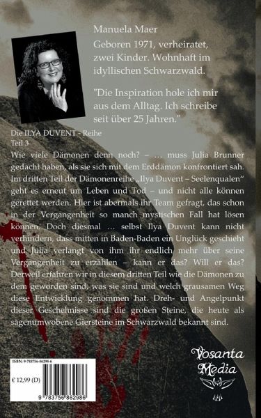 Ilya Duvent - SeelenqualenIm dritten Teil der Ilya Duvent - Fantasy Reihe ist Julia mit ihrem Mitarbeiter Pascal Weger bemüht, hinter das Geheimnis zu kommen, wo sich der Erddämon Cruel Déblai befindet. Mit Hilfe von Ilya Duvent, dem Dämon der Winde, hofft sie, schnell fündig zu werden, bevor auch dieser Dämon missbraucht wird. Zu spät, stellen sie fest, als der Nachlassverwalter von Akabotts Vermögen plötzlich Ansprüche auf das Geld erhebt. Er hat ein Druckmittel, dem sie zunächst Schutzlos ausgeliefert sind - Cruel Déblai.Derweil lesen wir, wie die Dämonen zu dem geworden sind, was sie heute sind. Dazu führt uns die Autorin über 2000 Jahre in der Zeitrechnung zurück. Da gibt es Maledin, eine junge verbitterte Frau, die auf ihre Art versucht sich dem familiären Druck zu entziehen und ihre eigenen Fäden spinnt.Wie kommts, das Julia über 2000 Jahre später auf Maledin trifft und dabei um ihr Leben kämpfen muss? ... auch ein gutes Ende muss nicht immer gut ausgehen.