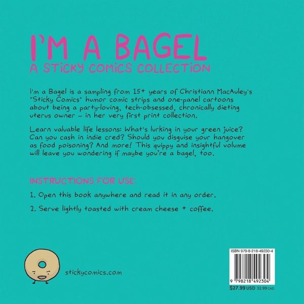 I'm a Bagel is a sampling from 15+ years of Christiann MacAuley's "Sticky Comics" humor comic strips and one-panel cartoons about being a party-loving, tech-obsessed, chronically dieting uterus owner - in her very first print collection. Learn valuable life lessons: What's lurking in your green juice? Can you cash in indie cred? Should you disguise your hangover as food poisoning? And more! This quippy and insightful volume will leave you wondering if maybe you're a bagel, too. INSTRUCTIONS FOR USE: 1. Open this book anywhere and read it in any order. 2. Serve lightly toasted with cream cheese + coffee.