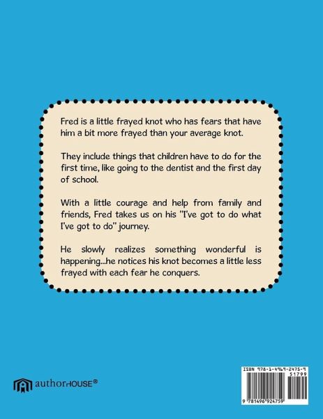 Fred is a little frayed knot who has fears that have him a bit more frayed than your average knot. They include things that children have to do for the first time, like going to the dentist and the first day of school. With a little courage and help from family and friends, Fred takes us on his "I've got to do what I've got to do" journey. He slowly realizes something wonderful is happening...he notices his knot becomes a little less frayed with each fear he conquers.