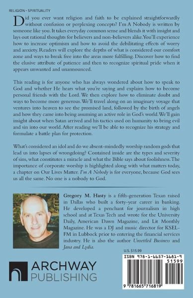 Did you ever want religion and faith to be explained straightforwardly without confusion or perplexing concepts? I'm A Nobody is written by someone like you. It takes everyday common sense and blends it with insight and lays out rational thoughts for believers and non-believers alike. You'll experience how to increase optimism and how to avoid the debilitating effects of worry and anxiety. Readers will explore the depths of what is considered our comfort zone and ways to break free into the areas more fulfilling. Discover how to find the elusive attribute of patience and then to recognize spiritual pride when it appears unwanted and unannounced. This reading is for anyone who has always wondered about how to speak to God and whether He hears what you're saying and explains how to become personal friends with the Lord. We then explore how to eliminate doubt and ways to become more generous. We'll travel along on an imaginary voyage that ventures into heaven to see the promised land, followed by the birth of angels and how they came into being assuming an active role in God's world. We'll gain insight about when Satan arrived and his tactics used on humanity to bring evil and sin into our world. After reading we'll be able to recognize his strategy and formulate a battle plan for protection. What's considered an idol and do we absent-mindedly worship random gods that lead us into lapses of wrongdoing? Contained inside are the types and severity of sins, what constitutes a miracle and what the Bible says about foolishness. The importance of corporate worship is highlighted along with what matters today, a chapter on Our Lives Matter. I'm A Nobody is for everyone, because God sees us all the same. No one is a nobody to God.