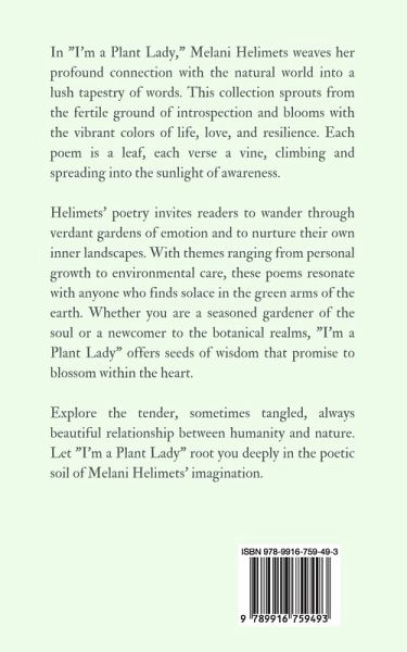 In "I'm a Plant Lady," Melani Helimets weaves her profound connection with the natural world into a lush tapestry of words. This collection sprouts from the fertile ground of introspection and blooms with the vibrant colors of life, love, and resilience. Each poem is a leaf, each verse a vine, climbing and spreading into the sunlight of awareness. Helimets' poetry invites readers to wander through verdant gardens of emotion and to nurture their own inner landscapes. With themes ranging from personal growth to environmental care, these poems resonate with anyone who finds solace in the green arms of the earth. Whether you are a seasoned gardener of the soul or a newcomer to the botanical realms, "I'm a Plant Lady" offers seeds of wisdom that promise to blossom within the heart. Explore the tender, sometimes tangled, always beautiful relationship between humanity and nature. Let "I'm a Plant Lady" root you deeply in the poetic soil of Melani Helimets' imagination. Copyright © 2024 Book Fairy Publishing