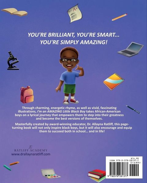 You're Brilliant, You're Smart... You're Simply AMAZING! Through charming, energetic rhyme, as well as vivid, extraordinary illustrations, I'm an AMAZING Little Black Boy takes African-American boys on a lyrical journey that empowers them to step into their greatness and become the best versions of themselves. Masterfully created by award-winning educator, Dr. Allayna Ratliff, this page-turning book will not only inspire black boys, but it will also encourage and equip them to succeed both in school... and in life!