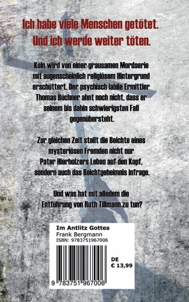 Köln wird von einer grausamen Mordserie mit augenscheinlich religiösem Hintergrund erschüttert. Der psychisch labile Ermittler Thomas Büchner ahnt noch nicht, dass er seinem bis dahin schwierigsten Fall gegenübersteht.