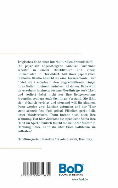 Tragisches Ende einer interkulturellen Freundschaft. Die psychisch angeschlagene Annabel Bachmann, kurz Bella, arbeitet in einem Detektivbüro und einem Blumenladen in Düsseldorf. Mit ihrer japanischen Freundin Hisako besucht sie eine Teezeremonie. Dort findet die Gastgeberin den abgeschnittenen Finger ihres Gatten in einem ominösen Kästchen. Bella wird unversehens in eine grausame Mordintrige verwickelt und verliert dabei nicht nur ihre liebgewonnene Freundin, sondern auch fast ihren Verstand. Sie fühlt sich plötzlich verfolgt und niemand will ihr glauben. Dann werden zwei Leichen aufgefunden und der Täter steht schnell fest. Fall gelöst? Plötzlich gerät Bella unter Mordverdacht. Dann brennt auch noch ihre Wohnung. Hat hier vielleicht die japanische Mafia ihre Hand im Spiel? Panisch taucht sie bei ihrer Mutter in Hamburg unter. Kann ihr Chef Erich Rothbaum sie entlasten?Handlungsorte: Düsseldorf, Kyoto, Hawaii, Hamburg.