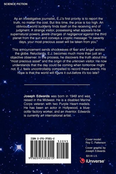 As an investigative journalist, E.J.'s first priority is to report the truth, no matter the cost. But this time, the price is too high. An oblivious world suddenly finds itself on the receiving end of judgment. A strange visitor, possessing what appears to be supernatural powers, levels charges of negligence against the third planet from the sun and conveys a cryptic message: "In seventy days, your most precious asset will be taken from you." This announcement sends shockwaves of fear and anger across the globe. Reluctantly, E.J. becomes much more than just an objective observer. In the process, he discovers the truth about this "most precious asset" and the origin of the unknown visitor. He now understands that the day could be coming when tomorrow might not. E.J. feels uncontrollably compelled to record these events. His hope is that the world will figure it out before it's too late?