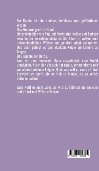 Ein Kelpie ist ein dunkles, herzloses und gefährliches Wesen. Des Einhorns größter Feind.Unterschiedlich wie Tag und Nacht sind Kelpie und Einhorn zwei Seiten derselben Medaille. Sie leben in vollkommenunterschiedlichen Welten und gehören nicht zusammen. Und doch gelingt es dem dunklen Kelpie ein Einhorn zu fangen.Das jüngste der Herde.Luna ist dem herzlosen Mann ausgeliefert, eine Flucht unmöglich. Allein der Versuch hat fatale, schmerzhafte undvor allem bleibende Folgen. Doch was will er von ihr? Was bezweckt er damit, sie an sich zu binden, sie an seiner Seite zu haben?Luna weiß es nicht, aber sie wird es bald auf die ein oder andere Art und Weise erfahren ...