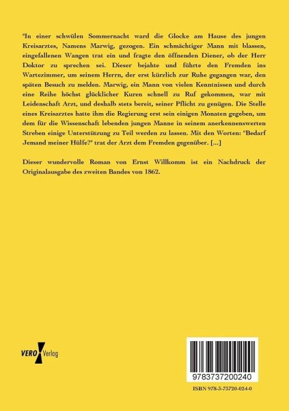 "In einer schwülen Sommernacht ward die Glocke am Hause des jungen Kreisarztes, Namens Marwig, gezogen. Ein schmächtiger Mann mit blassen, eingefallenen Wangen trat ein und fragte den öffnenden Diener, ob der Herr Doktor zu sprechen sei. Dieser bejahte und führte den Fremden ins Wartezimmer, um seinem Herrn, der erst kürzlich zur Ruhe gegangen war, den späten Besuch zu melden. Marwig, ein Mann von vielen Kenntnissen und durch eine Reihe höchst glücklicher Kuren schnell zu Ruf gekommen, war mit Leidenschaft Arzt, und deshalb stets bereit, seiner Pflicht zu genügen. Die Stelle eines Kreisarztes hatte ihm die Regierung erst sein einigen Monaten gegeben, um dem für die Wissenschaft lebenden jungen Manne in seinem anerkennenswerten Streben einige Unterstützung zu Teil werden zu lassen. Mit den Worten: "Bedarf Jemand meiner Hülfe?" trat der Arzt dem Fremden gegenüber. [...]