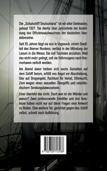 Das Schulschiff Deutschland ist ein alter Dreimaster, gebaut 1927. Sie diente über Jahrzehnte der Ausbildung des Offiziersnachwuchses der deutschen Handelsmarine.Seit 25 Jahren liegt sie nun in Vegesack, einem Stadtteil des Bremer Nordens, vertäut in der Mündung der Lesum in die Weser. Sie soll Touristen anziehen. Weil das nicht mehr gelingt, soll sie frühmorgens nach Bremerhaven verholt werden.Am Abend davor treiben sich sechs Gestalten auf dem Schiff herum, erfüllt von Angst vor Abschiebung, Gier auf Drogengeld, Rachlust für Verrat, Eifersucht, Zorn wegen eines sexuellen Übergriffs und vaterländischem Sendungsbewusstsein.Einer überlebt das nicht. Doch wer ist der Mörder und warum? Zwei professionelle Ermittler und drei Amateure haben nicht nur auf diese Fragen eine Antwort zu finden. Eine weitere Tat, gerichtet gegen das Schiff selbst, schreit nach Aufklärung.