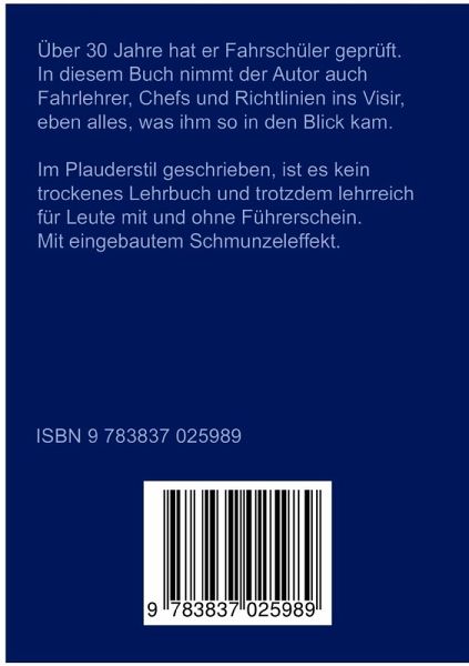 Über 30 Jahre hat er Fahrschüler geprüft. In diesem Buch nimmt der Autor auch Fahrlehrer, Chefs und Richtlinien ins Visier, eben alles, was ihm so in den Blick kam.Im Plauderstil geschrieben, ist es kein trockenes Lehrbuch und trotzdem lehrreich für Leute mit und ohne Führerschein.Mit eingebautem Schmunzeleffekt.