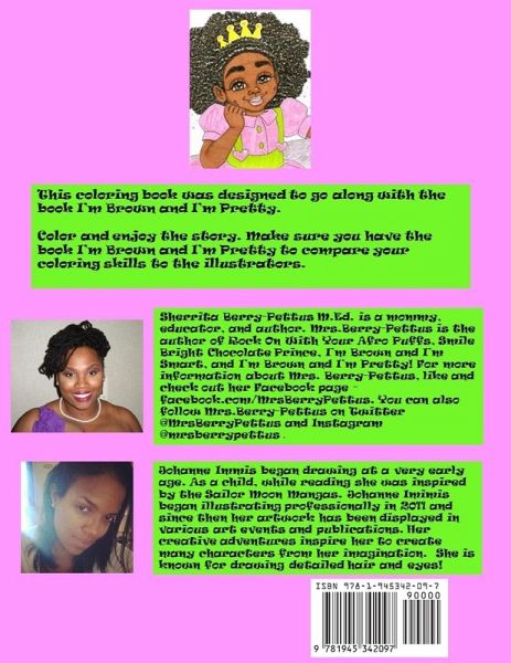 This coloring book was designed to go along with the book I'm Brown and I'm Pretty. Color and enjoy the story. Make sure you have the book I'm Brown and I'm Pretty to compare your coloring skills to the illustrators. A smart and confident little girl named Sherrita shares a little pep talk to all little brown girls in the world. Sherrita makes friends with the reader and shows them why it's important to love themselves as themselves. She teaches the reader that they are pretty in their brown skin! About the Author- Sherrita Berry-Pettus M.Ed. is a mommy, educator, and author. Mrs.Berry-Pettus is the author of Rock On With Your Afro Puffs, Smile Bright Chocolate Prince, I'm Brown and I'm Smart, and I'm Brown and I'm Pretty! For more information about Mrs. Berry-Pettus, like and check out her Facebook page - facebook.com/MrsBerryPettus. You can also follow Mrs.Berry-Pettus on Twitter @MrsBerryPettus and Instagram @mrsberrypettus .