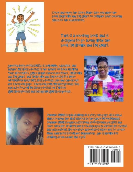 This is a coloring book and is designed to go along with the book I'm Brown and I'm Smart.Color and enjoy the story. Make sure you have the book I'm Brown and I'm Smart to compare your coloring skills to the illustrators. A smart and confident little boy named Ahmari shares a little pep talk to little brown boys in the world. Ahmari makes friends with the reader and shows them why it's important to love themselves as themselves. He teaches the reader that they can be smart and brown! About the Author- Sherrita Berry-Pettus M.Ed. is a mommy, educator, and author. Mrs.Berry-Pettus is the author of Rock On With Your Afro Puffs, Smile Bright Chocolate Prince, I'm Brown and I'm Smart, and I'm Brown and I'm Pretty! For more information about Mrs. Berry-Pettus, like and check out her Facebook page - facebook.com/MrsBerryPettus. You can also follow Mrs.Berry-Pettus on Twitter @MrsBerryPettus and Instagram @mrsberrypettus .