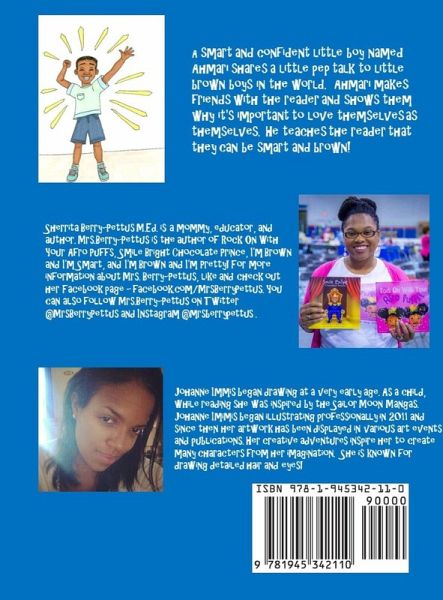 A smart and confident little boy named Ahmari shares a little pep talk to little brown boys in the world. Ahmari makes friends with the reader and shows them why it's important to love themselves as themselves. He teaches the reader that they can be smart and brown! About the Author- Sherrita Berry-Pettus M.Ed. is a mommy, educator, and author. Mrs.Berry-Pettus is the author of Rock On With Your Afro Puffs, Smile Bright Chocolate Prince, I'm Brown and I'm Smart, and I'm Brown and I'm Pretty! For more information about Mrs. Berry-Pettus, like and check out her Facebook page - facebook.com/MrsBerryPettus. You can also follow Mrs.Berry-Pettus on Twitter @MrsBerryPettus and Instagram @mrsberrypettus .