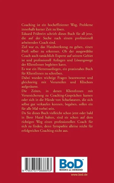 Coaching ist ein hocheffizienter Weg, Probleme innerhalb kurzer Zeit zu lösen.Eduard Frühwirt schrieb dieses Buch für all jene, die auf der Suche nach einem professionell arbeitenden Coach sind. Ziel war es, das Handwerkzeug zu geben, einen Profi selber zu erkennen. Ob der ausgewählte Coach auch tatsächlich Experte auf seinem Gebiet ist und professionell Anliegen und Lösungswege der KlientInnen begleiten kann.Es war ein Herzensanliegen, ein praxisnahes Buch für KlientInnen zu schreiben.Dabei wurden wichtige Fragen beantwortet und gleichzeitig mit Vorurteilen und Klischees aufgeräumt.Die Zeiten, in denen KlientInnen mit Verunsicherung zu Coaching-Gesprächen kamen oder sich in die Hände von Scharlatanen, die sich selbst gut verkaufen konnen, begaben, sollen ein für alle Mal vorbei sein.Da Sie dieses Buch vielleicht schon jetzt oder bald in Ihrer Hand halten, sind sie schon auf dem richtigen Weg einen professionellen Coach für sich zu finden, denn Sympathie alleine reicht für erfolgreiches Coaching nicht aus.