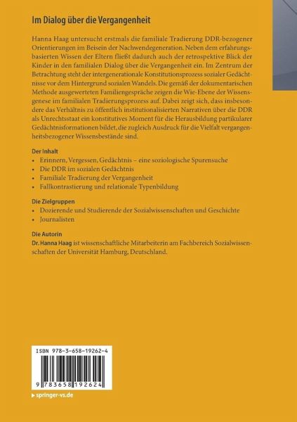Hanna Haag untersucht erstmals die familiale Tradierung DDR-bezogener Orientierungen im Beisein der Nachwendegeneration. Neben dem erfahrungsbasierten Wissen der Eltern fließt dadurch auch der retrospektive Blick der Kinder in den familialen Dialog über die Vergangenheit ein. Im Zentrum der Betrachtung steht der intergenerationale Konstitutionsprozess sozialer Gedächtnisse vor dem Hintergrund sozialen Wandels. Die gemäß der dokumentarischen Methode ausgewerteten Familiengespräche zeigen die Wie-Ebene der Wissensgenese im familialen Tradierungsprozess auf. Dabei zeigt sich, dass insbesondere das Verhältnis zu öffentlich institutionalisierten Narrativen über die DDR als Unrechtsstaat ein konstitutives Moment für die Herausbildung partikularer Gedächtnisformationen bildet, die zugleich Ausdruck für die Vielfalt vergangenheitsbezogener Wissensbestände sind.