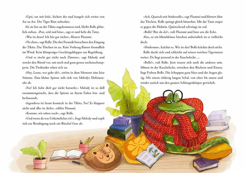 Eigentlich ein Tag wie viele in der Tikita, der Tierkindertagesstätte, doch dann ist Erzieher-Python Bolle krank und liegt ganz schlapp in der Kuschelecke. Für Elefant Melody, Affe Flummi, Spinne Fee und den Tiger Ralle ist klar: sie helfen Bolle, um