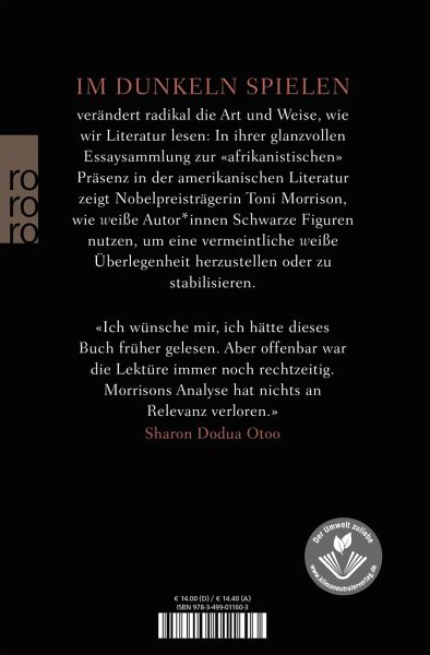 «Im Dunkeln spielen» ist ein herausragendes Werk der Literaturkritik, das ein neues Kapitel im Dialog über Rassismus aufschlug - und verspricht, auch heute noch die Art und Weise zu verändern, wie wir Literatur lesen. Eine glanzvolle Essaysammlung, in der Nobelpreisträgerin Toni Morrison die amerikanische Literatur einer augenöffnenden Analyse unterzieht. Morrison zeigt, wie sehr die Themen Freiheit und Individualismus, Männlichkeit und Unschuld von der Existenz einer Schwarzen Bevölkerung abhängen, die offenkundig unfrei war - und die weißen Autor:innen als Gegenpol ihrer eigenen Identität diente. Morrison entwirft «die Möglichkeit Amerikas neu, sie zeichnet sie neu» (Chicago Tribune). Ihre brillanten Erörterungen der «afrikanistischen» Präsenz in den Romanen von Poe, Melville, Catherund Hemingway führen zu einer dramatischen Neubewertung der wesentlichen Merkmale literarischer Tradition. Geschrieben mit der künstlerischen Vision, die der außergewöhnlichen Autorin Toni Morrison einen herausragenden Platz in der modernen Literatur eingebracht hat, ist diese Essaysammlung eine wertvolle Lektüre in Zeiten, in denen der Rassismusdiskurs auch in Deutschland hochaktuell ist.
